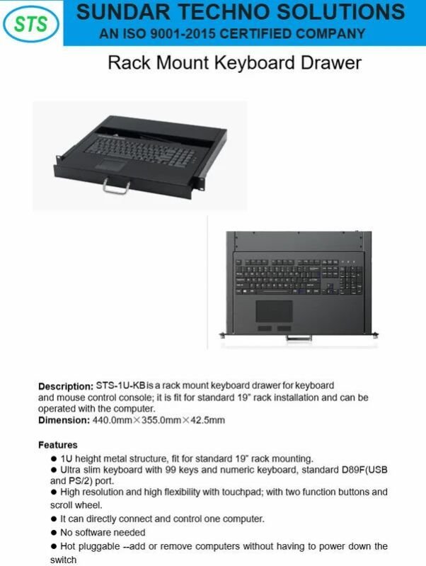 Description: STS-1U-KBis a rack mount keyboard drawerfor keyboard and mouse control console; it is fit for standard 19" rack installation and can be operated with the computer. 1U height metal structure, fit for standard 19" rack mounting. Ultra slim keyboard with 99 keys and numeric keyboard, standard D89F(USB and PS/2) port. High resolution and high flexibility with touchpad; with two function buttons and scroll wheel. It can directly connect and control one computer. No software needed Hot pluggable --add or remove computers without having to power down the switch
