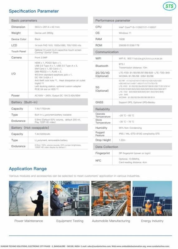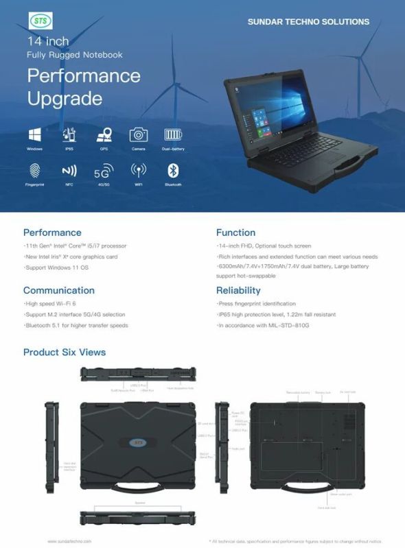 Performance ·11th Gen® Intel® Core™ i5/i7 processor ·New Intel Iris® Xe core graphics card ·Support Windows 11 OS Function ·14-inch FHD, Optional touch screen ·Rich interfaces and extended function can meet various needs ·6300mAh/7.4V+1750mAh/7.4V dual battery, Large battery support hot-swappable Reliability ·Press fingerprint identification ·IP65 high protection level, 1.22m fall resistant ·In accordance with MIL-STD-810G Communication ·High speed Wi-Fi 6 ·Support M.2 interface 5G/4G selection ·Bluetooth 5.1 for higher transfer speeds