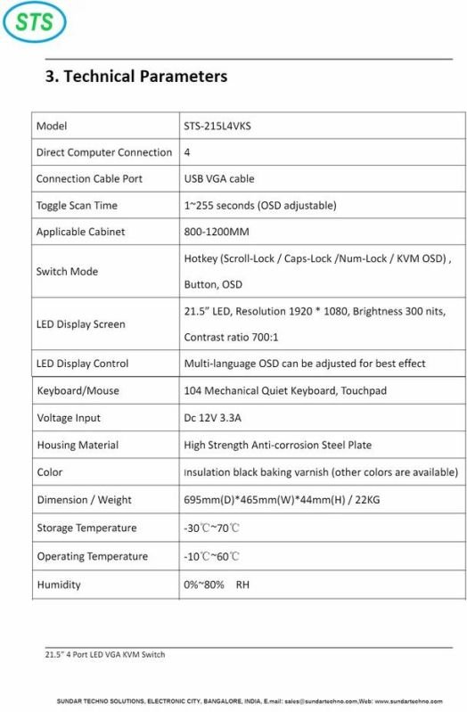 Integrated 21.5 "HD" LED screen/keyboard/mouse/switcher all-in-one machine Excellent video effect, best resolution up to 1920*1080@60Hz With complete DDC2B function, the screen signal can be detected without switching the computer. Dual Interface PS/2 & USB Keyboard and Mouse Switcher Connects to Control computer Drawer type. The length can be adjusted to fit each cabinet space. Auto-scan function enables KVM to automatically scan computers one by one. Compatible with Microsoft, Linux, Unix and other operating systems. LCD liquid crystal display adjustment function, guide rail with self-locking device
